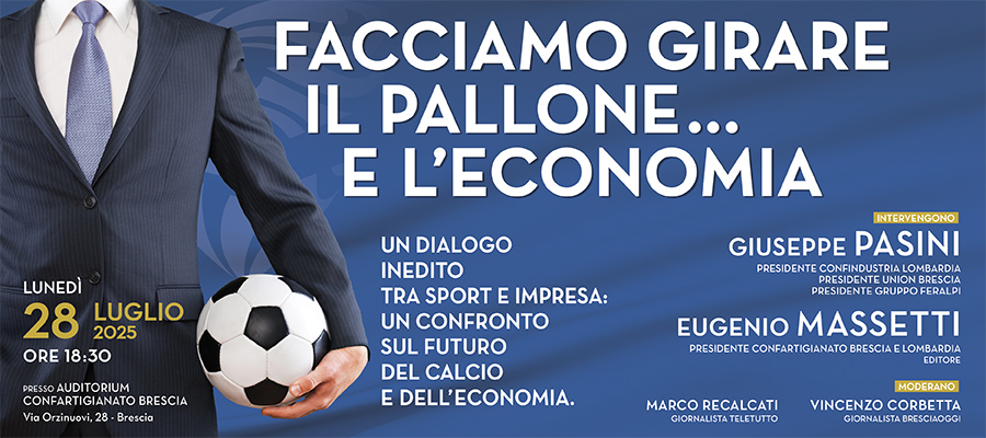 Lunedì 28 luglio alle ore 18:30, presso l’auditorium della sede di Confartigianato Imprese Brescia e Lombardia Orientale in via Orzinuovi 28, si terrà l’incontro pubblico “Facciamo girare il pallone… e l’economia”.