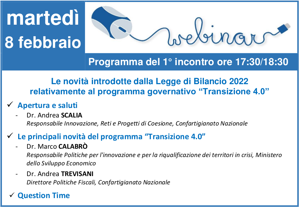 I primi 5 webinar saranno dedicati al programma governativo “Transizione 4.0”, che prevede incentivi e agevolazioni fiscali per le imprese che investono in innovazione. Tutti gli incontri si terranno sempre di martedì dalle ore 17:30 alle 18:30.