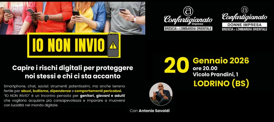 Il Movimento Donne di Confartigianato Brescia organizza “IO NON INVIO”, un incontro pubblico pensato per aiutare famiglie, genitori e giovani a orientarsi con maggiore consapevolezza nel mondo digitale, in programma a Lodrino (Bs), presso Vicolo Prandini 1, il 20 Gennaio 2026 alle ore 20:00.